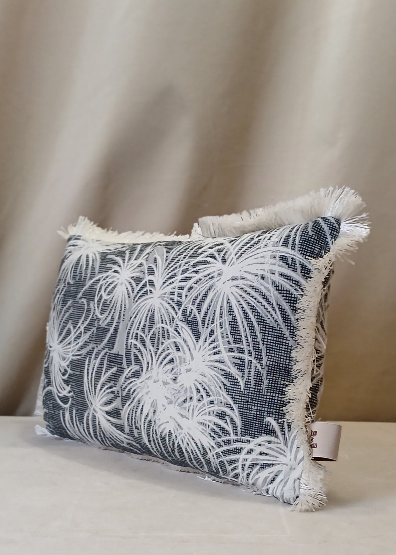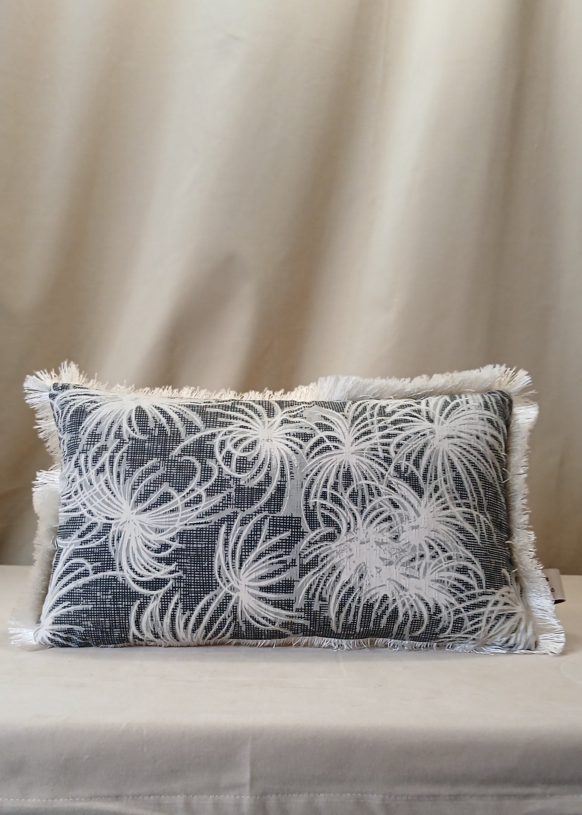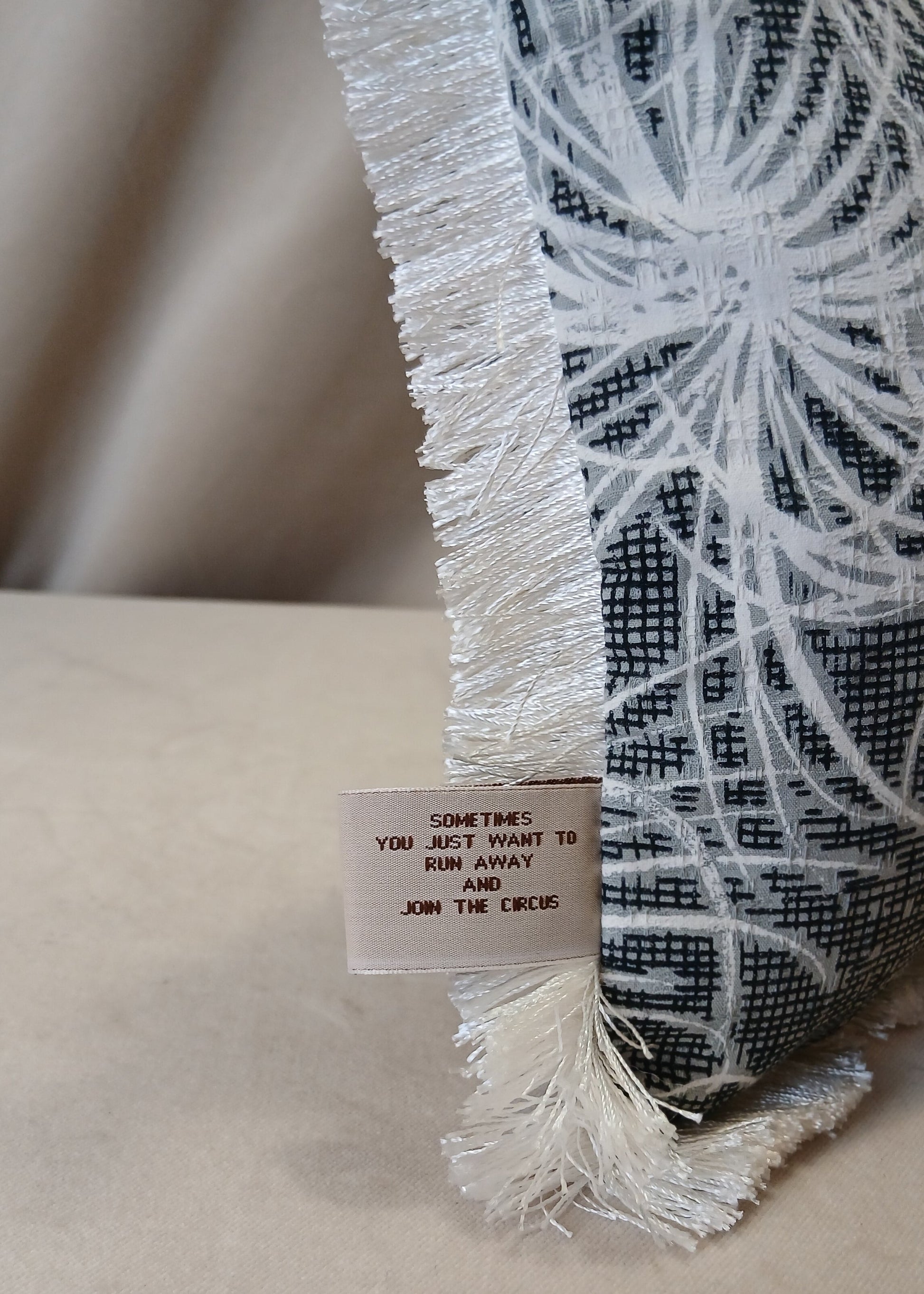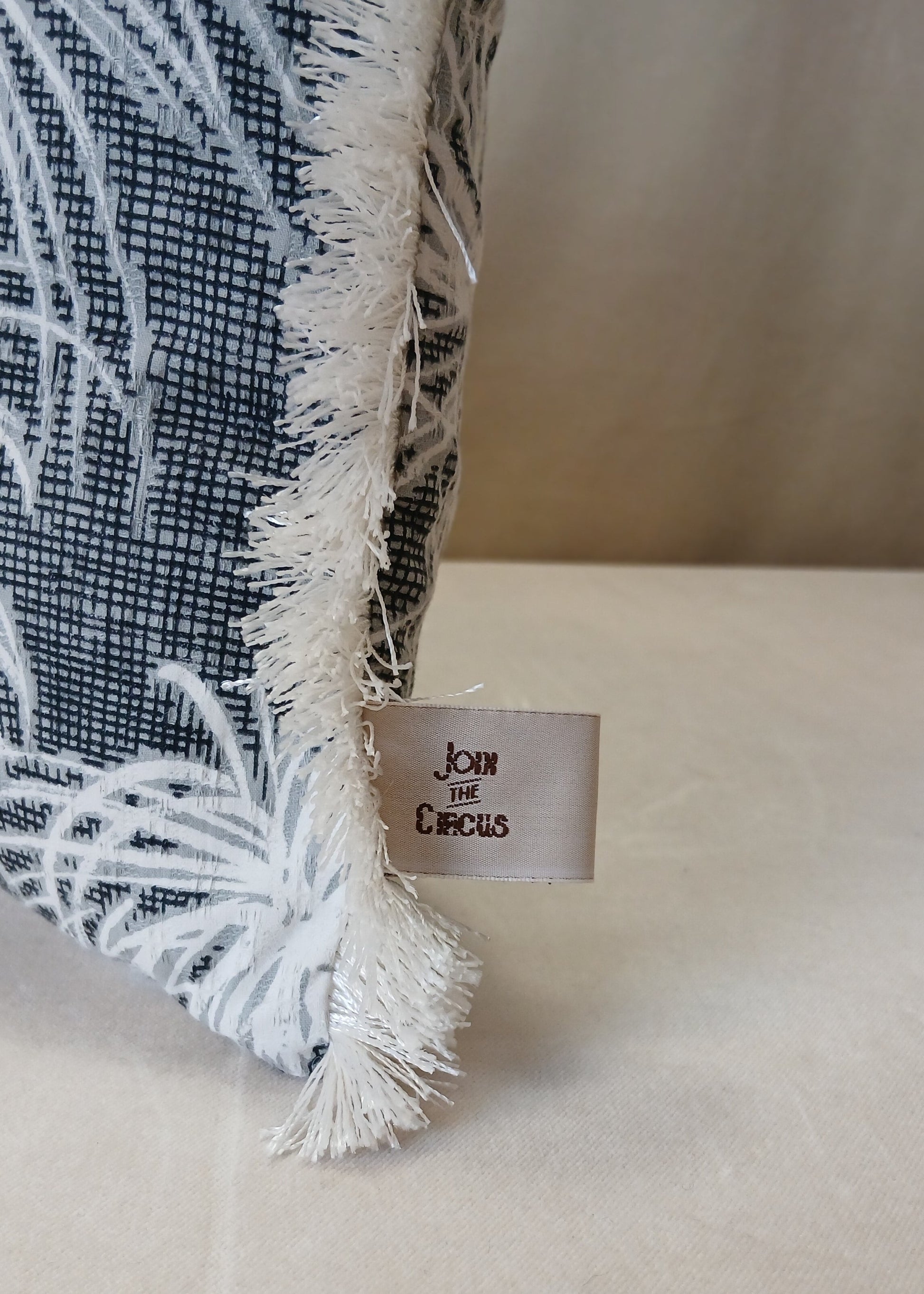 Hvit og sort pute med frynser, sydd i Circuset av Direktøren sjølv.