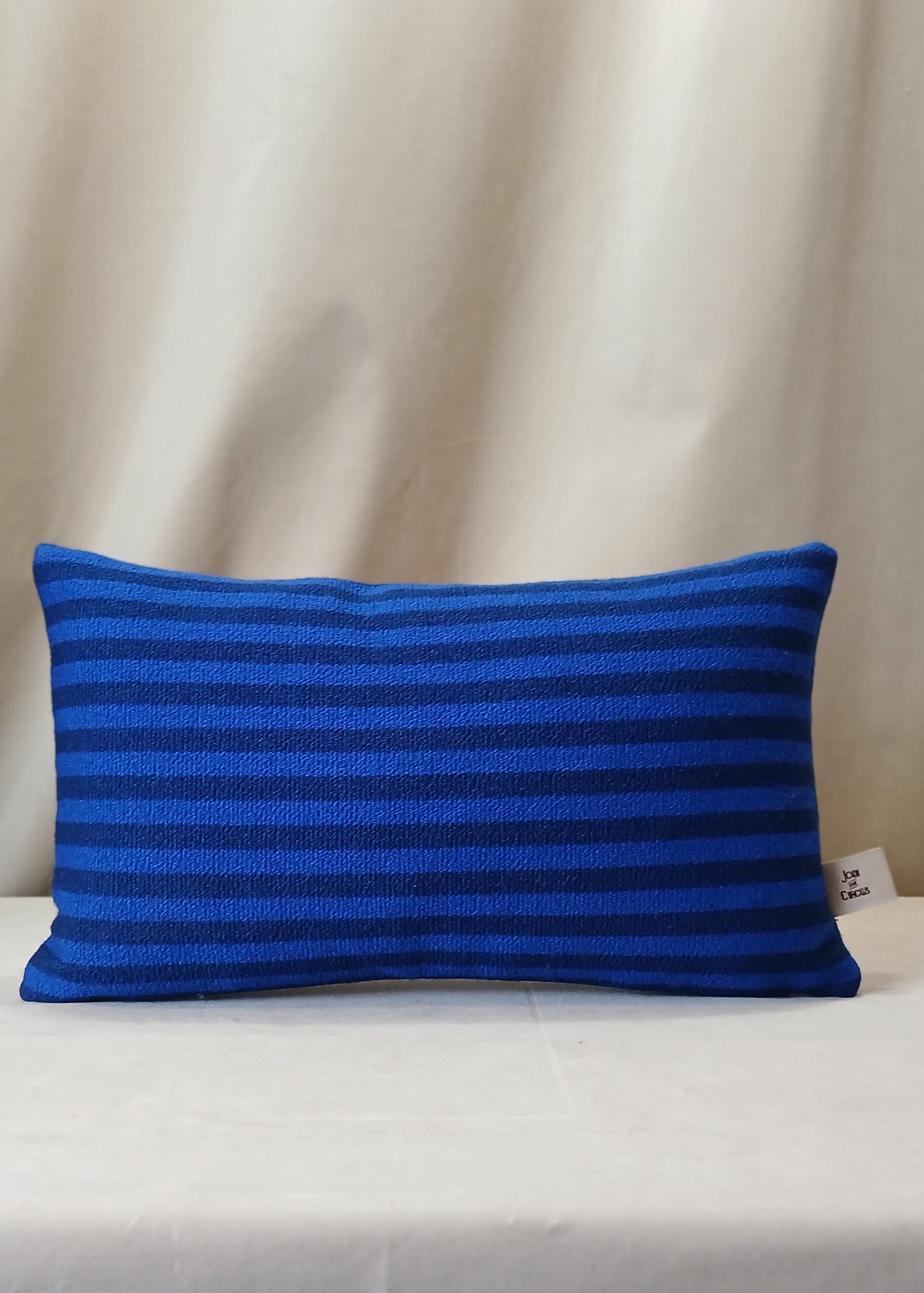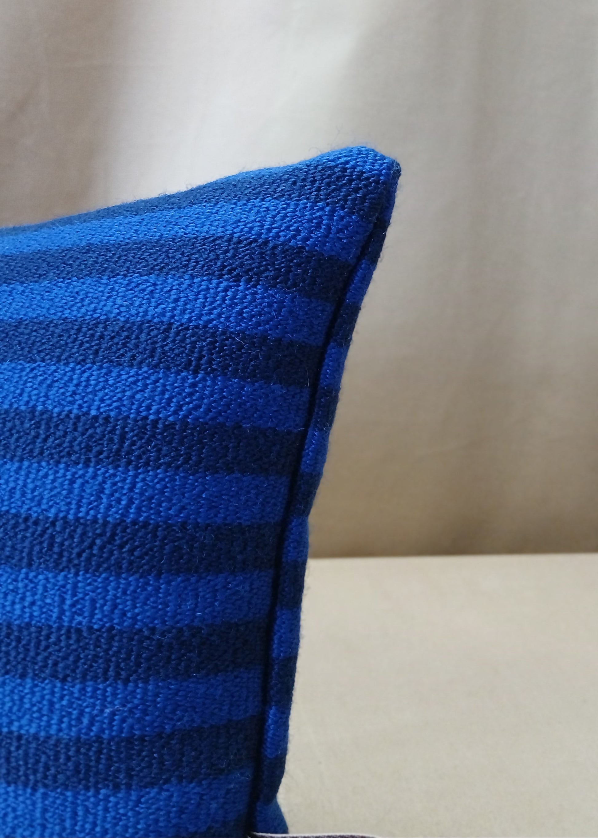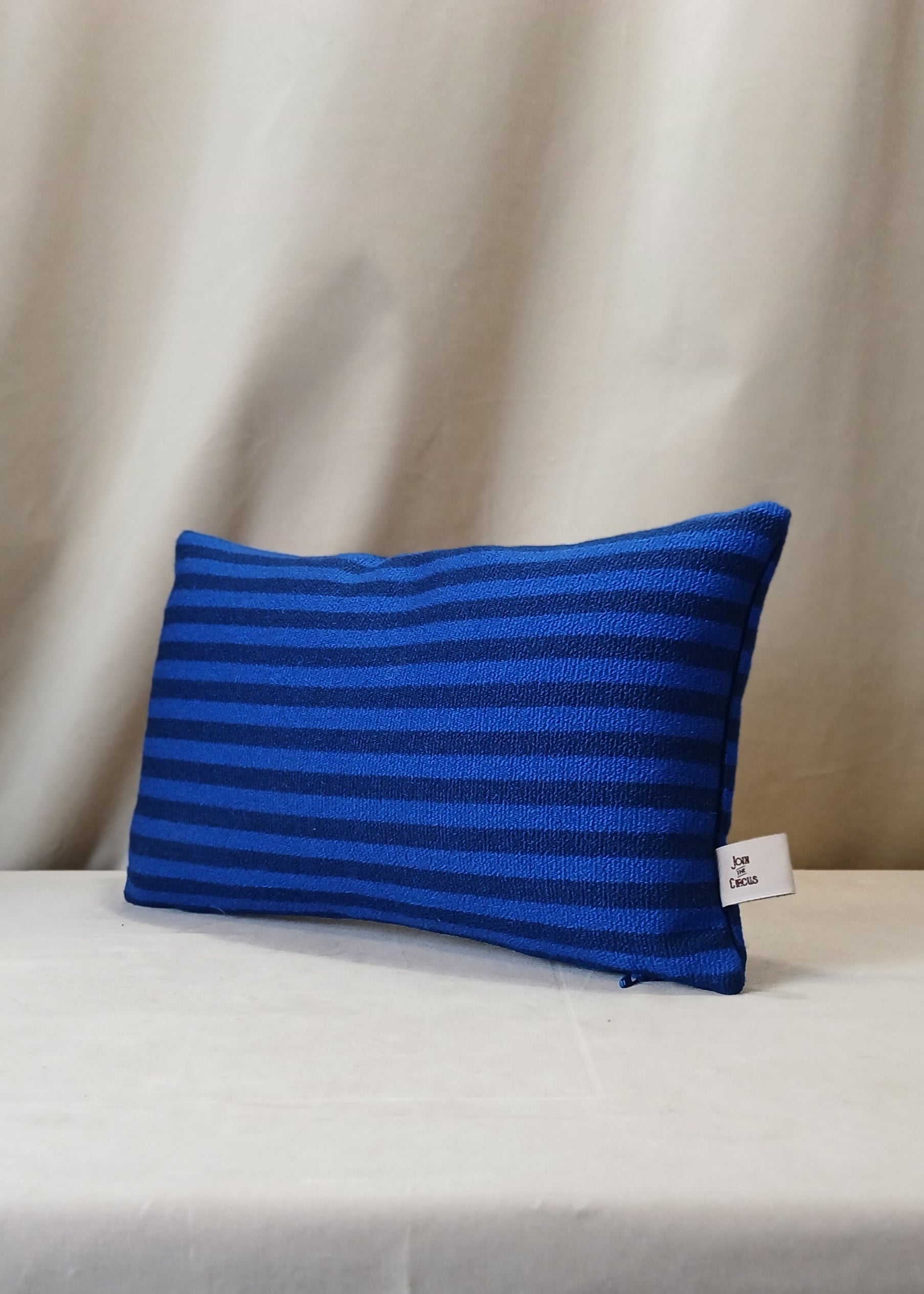 Liten Blå Pute sydd i oveskuddsmateriale fra møbelindustrien.