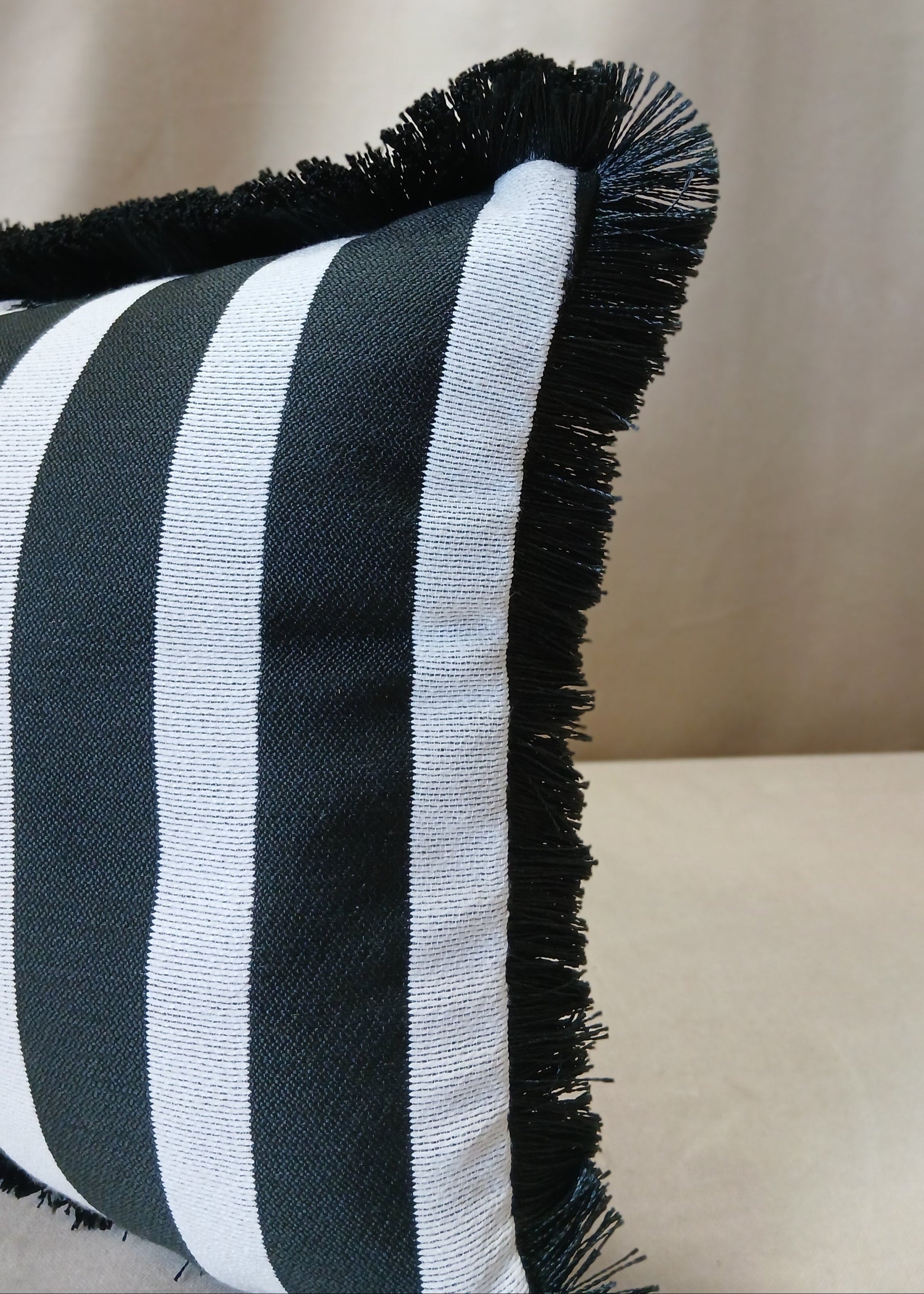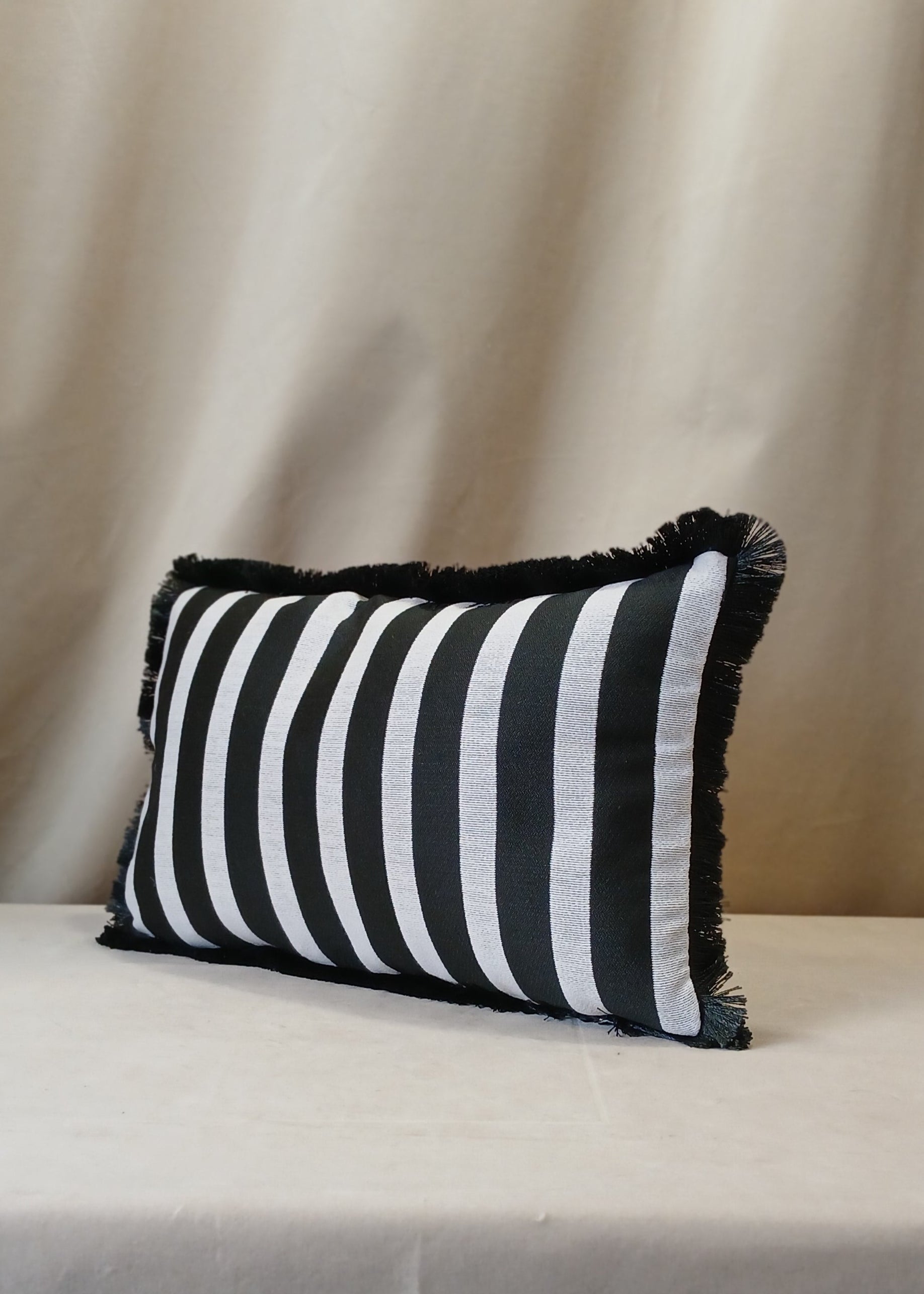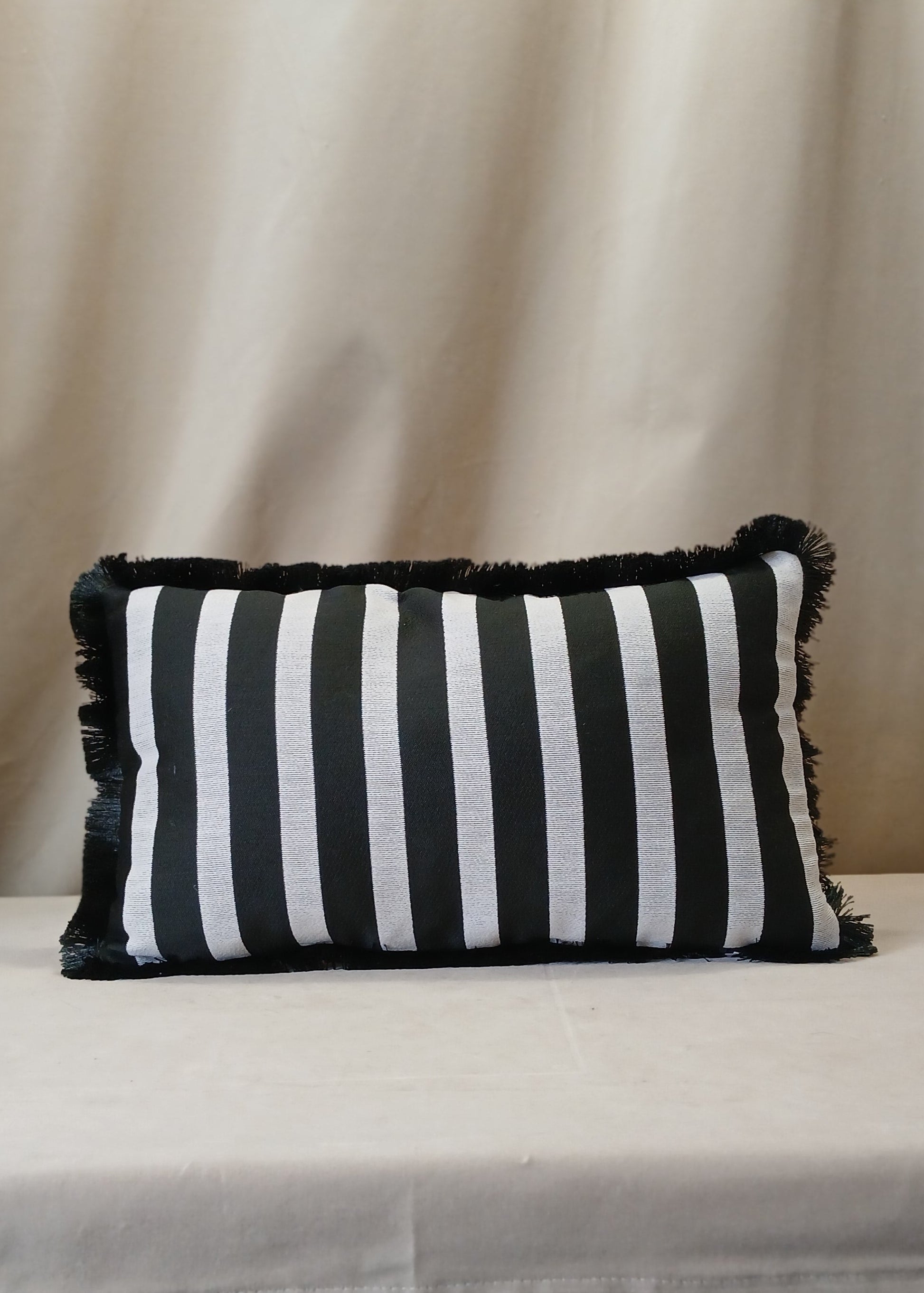 Sort og hvit pute med frynser, sydd av Direktøren sjølv.